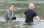 川に流された児童を救助する宇野克彦さん(左)=5日午前9時52分、豊後大野市犬飼町