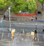 乗用車が突っ込んだ公園(上)と駐車場の出入り口(下)