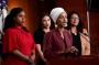 記者会見する4人の女性議員。手前右が、ソマリア出身の民主党議員イルハン・オマル氏(7月15日撮影)