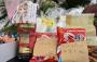 放火殺人事件のあった京都アニメーション第1スタジオの献花台に供えられた菓子。犠牲者の子と夫が書いたとみられるメッセージが添えられていた