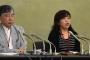「命より大切な仕事はない」と訴える過労死遺族の坂爪千恵子さん(右)。電通の過労死事件を担当した川人博弁護士とともに会見した=12日午後、東京・霞が関(天野健作撮影)