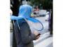 色は目立つ鮮やかな青色で、使わない時は捻って重ねるように折りたたんで収納可能です。使い方が簡単なのはいいのですが、公式サイトの説明で「1 ひろげて」「2 かぶるだけ(笑)」となっているのが気になります。なに笑ろてんねん。