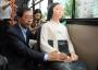 14日朝、ソウル市を走るバスに登場した少女像に触れる朴元淳(パクウォンスン)市長(ソウル市提供)