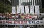 韓国スーパー協会の会員らは日本製のビールやスポーツ飲料をバケツにぶちまけるというパフォーマンスを決行。